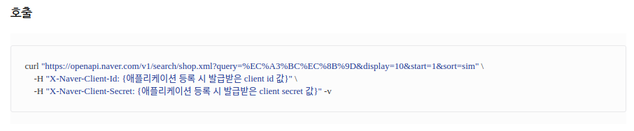 보면 헤더로는 X-Naver-Client-Id, X-Naver-Client-Screet가 필요하다고 되어있다.