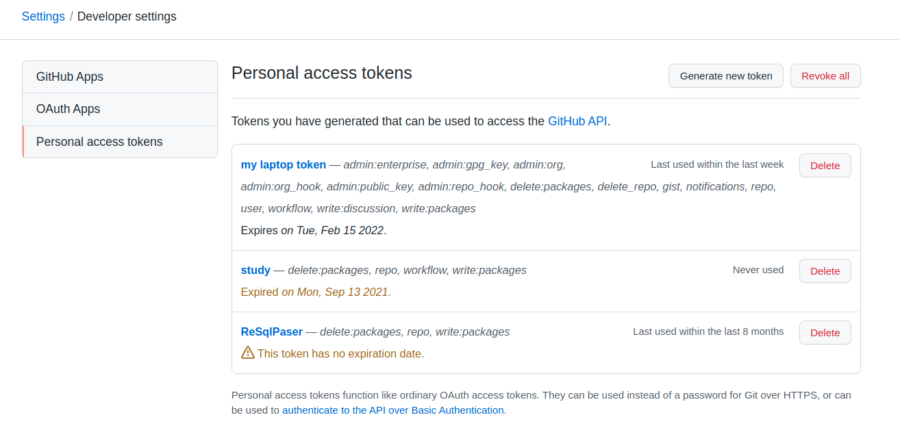 Git Hub 홈페이지 -> Settings-> Developer settings -> Personal access tokens 를 선택.