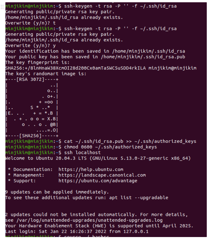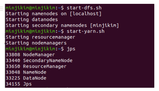 여기서 에러나는 사람들은 source ~/.bashrc 하거나, 혹은 위에서 했던 ssh localhost 부분 다시한번 하면됨. 나도 그렇게 해결했음.