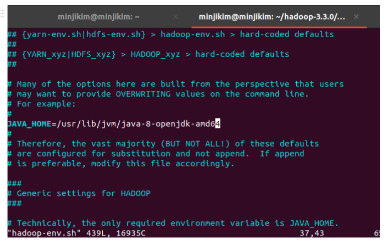 /hadoop-3.3.0/etc/hadoop/hadoop-env.sh 파일에서 JAVA_HOME을 적어줌