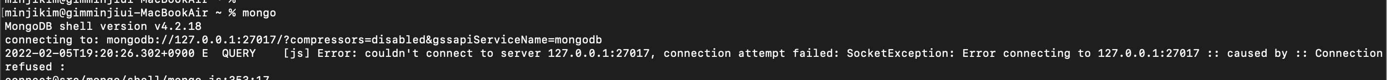 [MongoDB] mongo 에러 [js] Error: couldn't connect to server 127.0.0.1:27017 본문