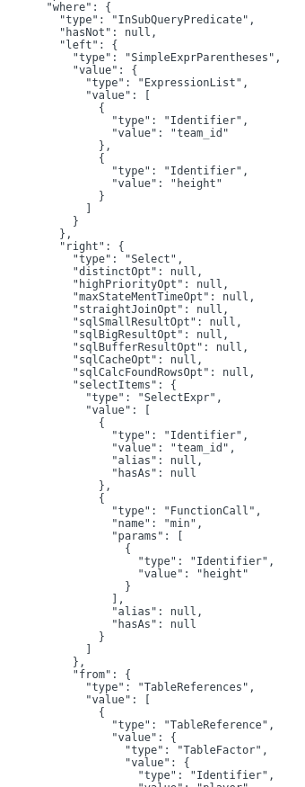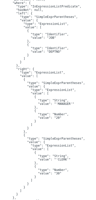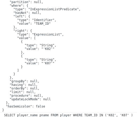 where 절의 type은 InExpressionListPredicate 이 되고, right, left value 의 type이 ExpressionList가 된 것 을 알 수 있다.