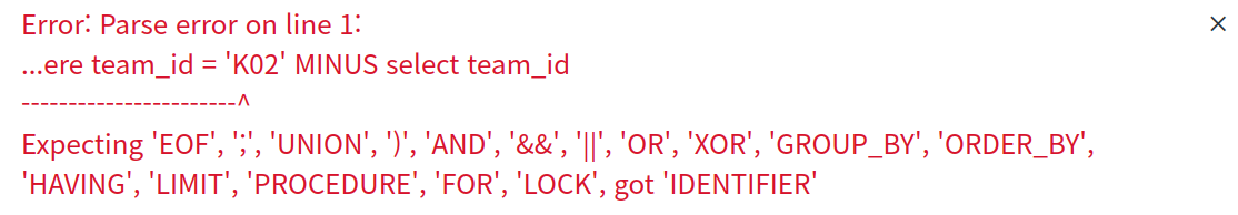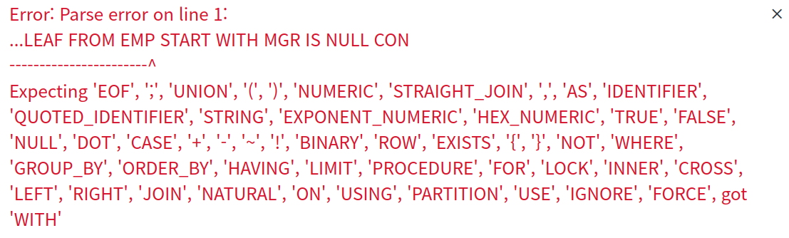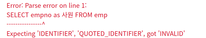 const ast = parser.parse("SELECT empno as 사원 FROM emp"); 으로 예제를 해봤는데 오류가 났다.