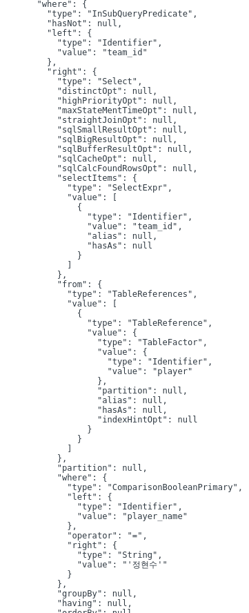 where절의 type이 ComparisionBoleanPrimary 가 되고 right의 type은 Null, value도 null 이 됨을 알 수 있다.