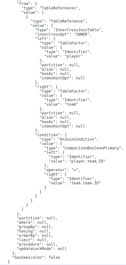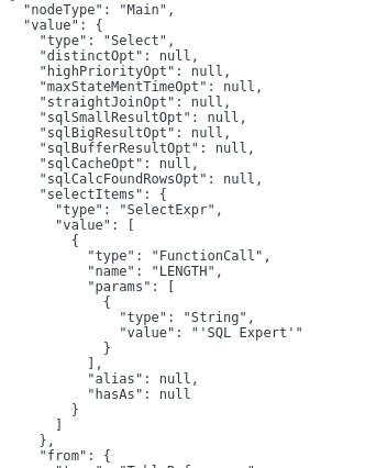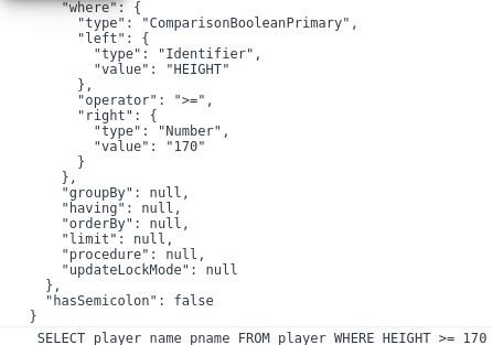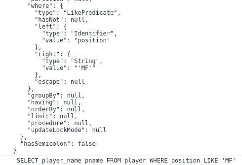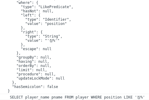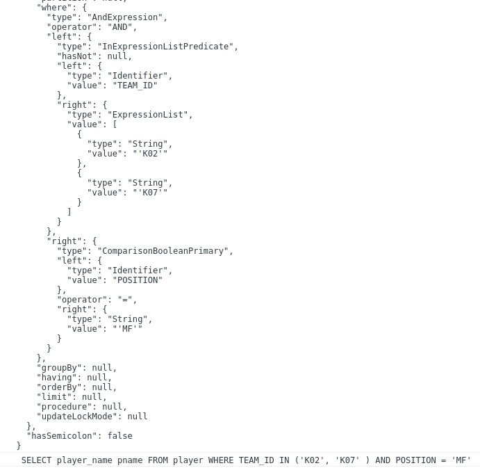 우선 parser에 sql문을 삽입하여 정상적으로 파싱 되는지 예제로 테스트를 해보자.