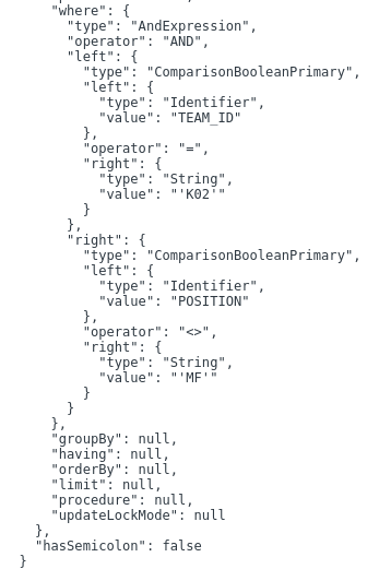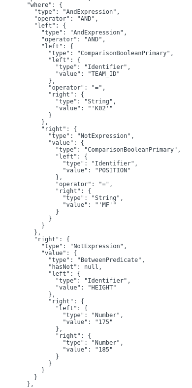 where 의 type 이 AndExpression 로 바뀌고, operator가 AND가 들어감을 알 수 있다. 그외는 IN을 사용했을 경우와 같은듯