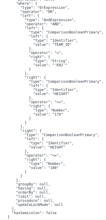 SQL(select) parser written with jison. parse SQL into abstract syntax tree(AST) and stringify back to SQL. sql grammar follows https://dev.mysql.com/doc/refman/5.7/en/select.html - JavaScriptor/js-...