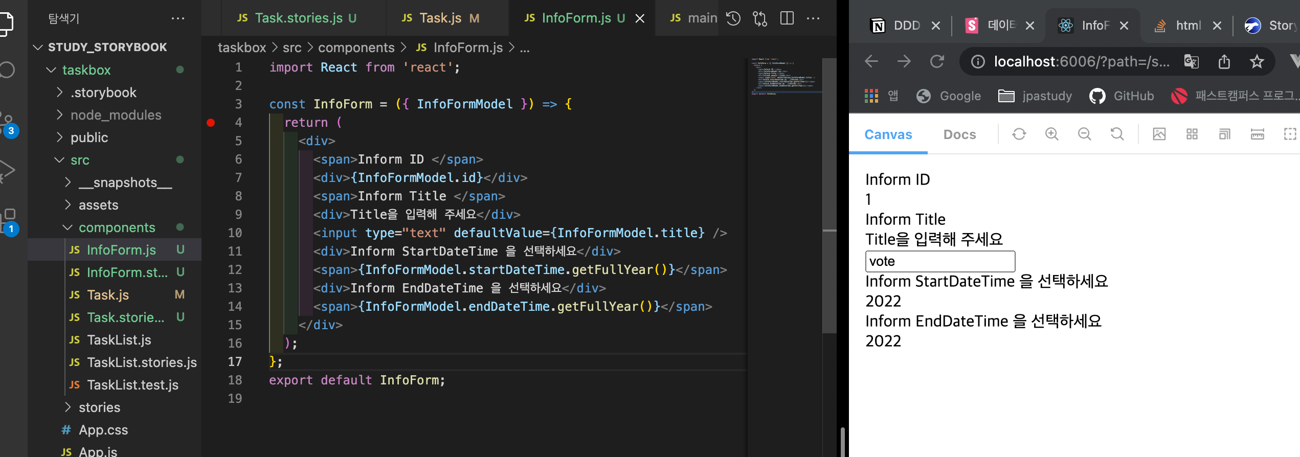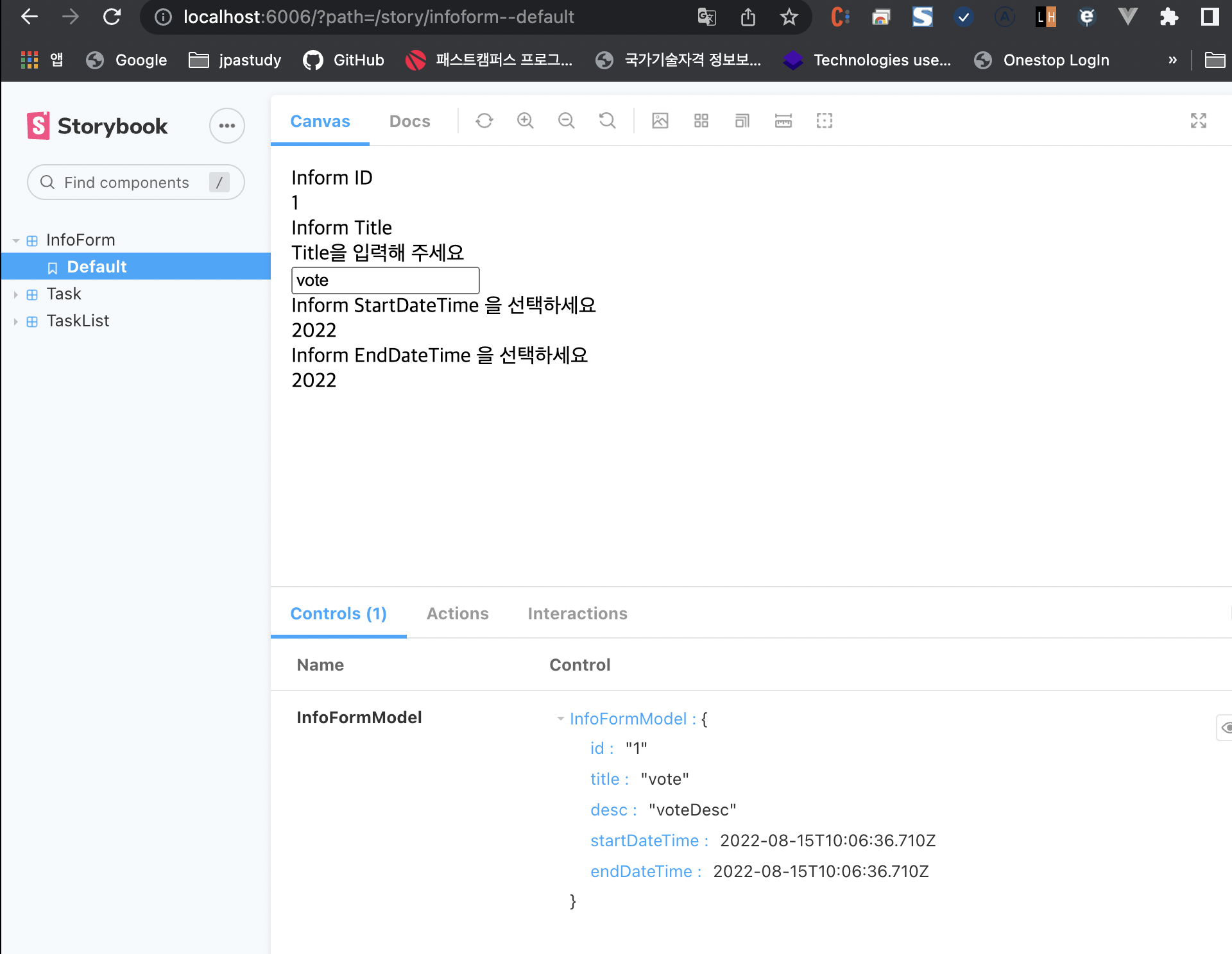 yarn storybook을 하게 되면 내가 만들어두었던 InfoForm.stories.js 를 바탕으로 로컬에서 확인해 볼 수 있다.
