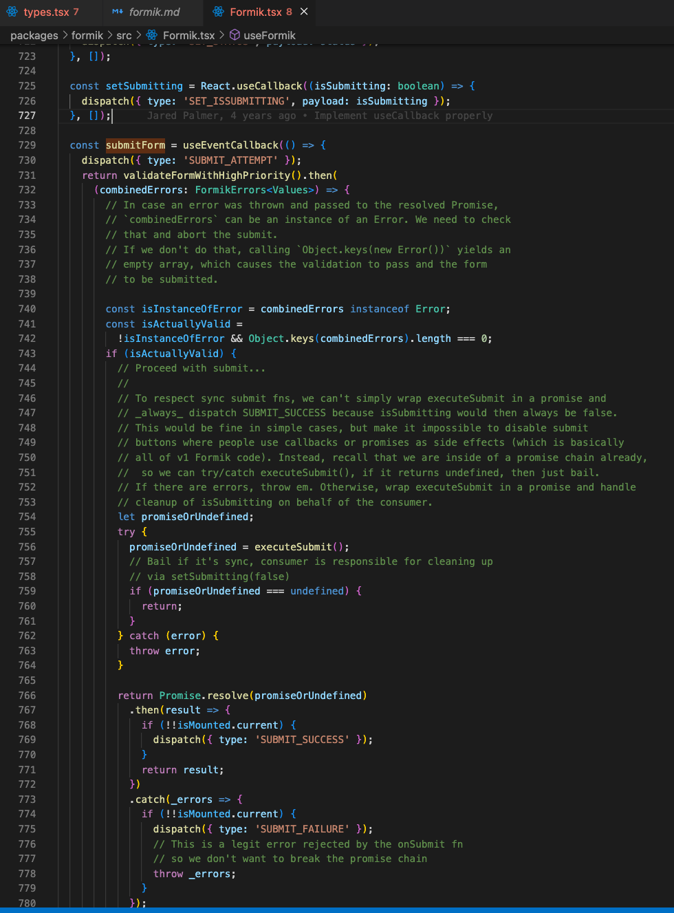 submitForm 함수 내부를 보게되면, promiseOrUndefined 가 promise여야 dispatch함수 내부로 들어가서 submitting에 대한 상태를 바꾸어주는데