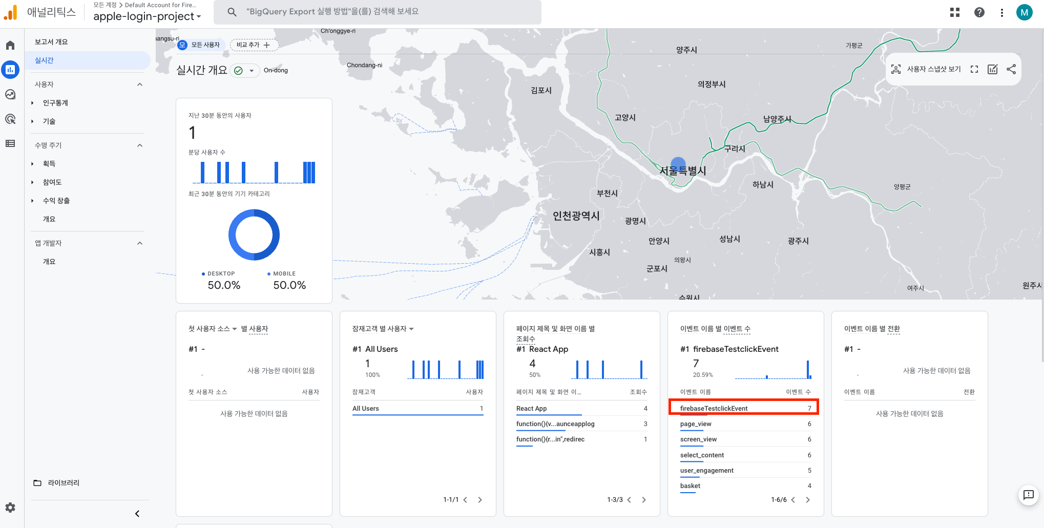 버튼을 클릭하고 > 실시간을 보면 추가해놓았던 logEvent가 등록됨을 알 수 있다.