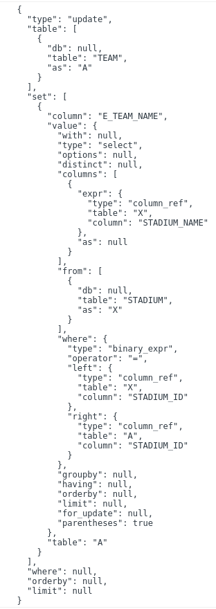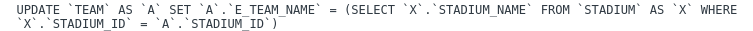 UPDATE TEAM A SET A.E_TEAM_NAME = (SELECT X.STADIUM_NAME FROM STADIUM X WHERE X.STADIUM_ID = A.STADIUM_ID)