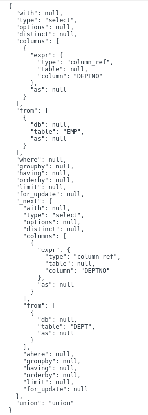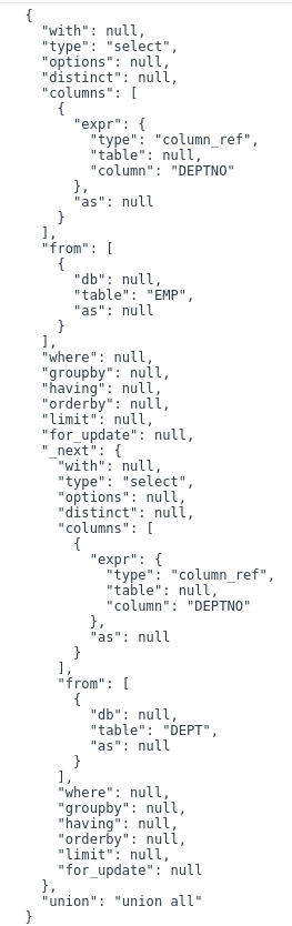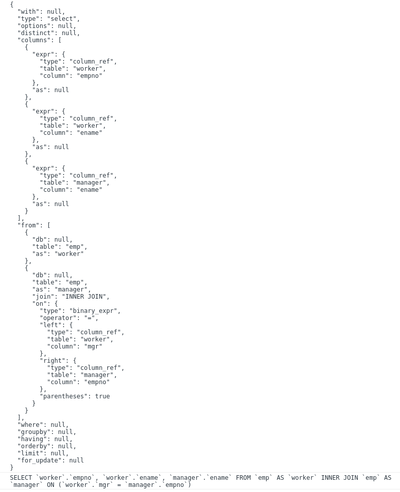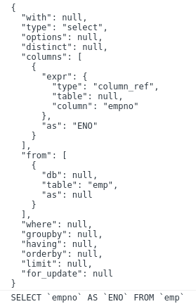 const ast = parser.astify("SELECT empno as ENO FROM emp", opt);