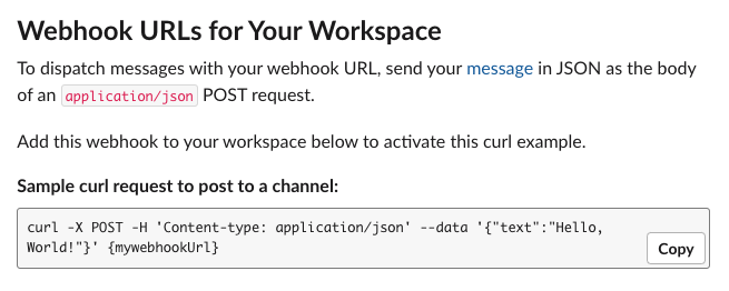 다시 https://api.slack.com/ 으로 접속하여 webhook Url curl을 copy 해서 터미널에 입력해보자.