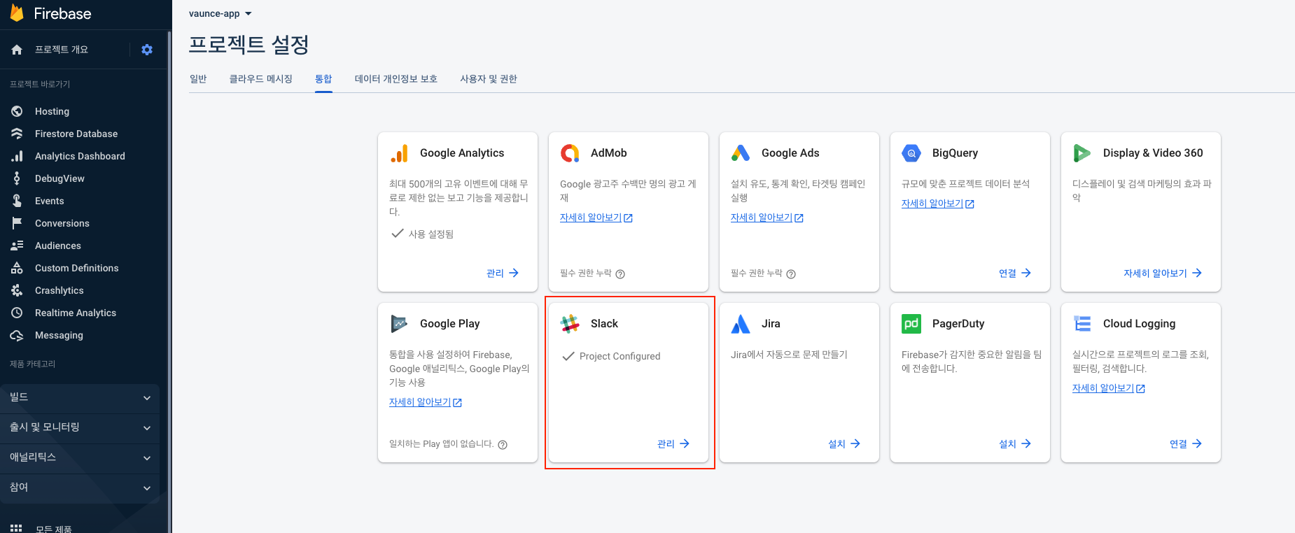 7. Firebase 프로젝트 설정 > 통합 > 슬랙 클릭