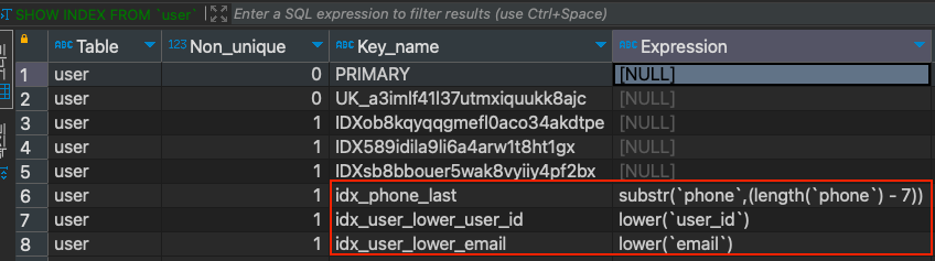 CREATE INDEX idx_phone_last ON user ((SUBSTRING(phone, LENGTH(phone) - 7)));