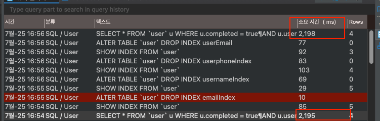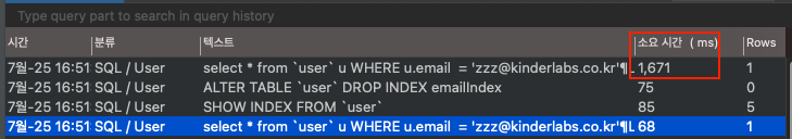 email도 마찬가지로 index를 붙이기전 1671 -> 68 ms 러 확 줄었음