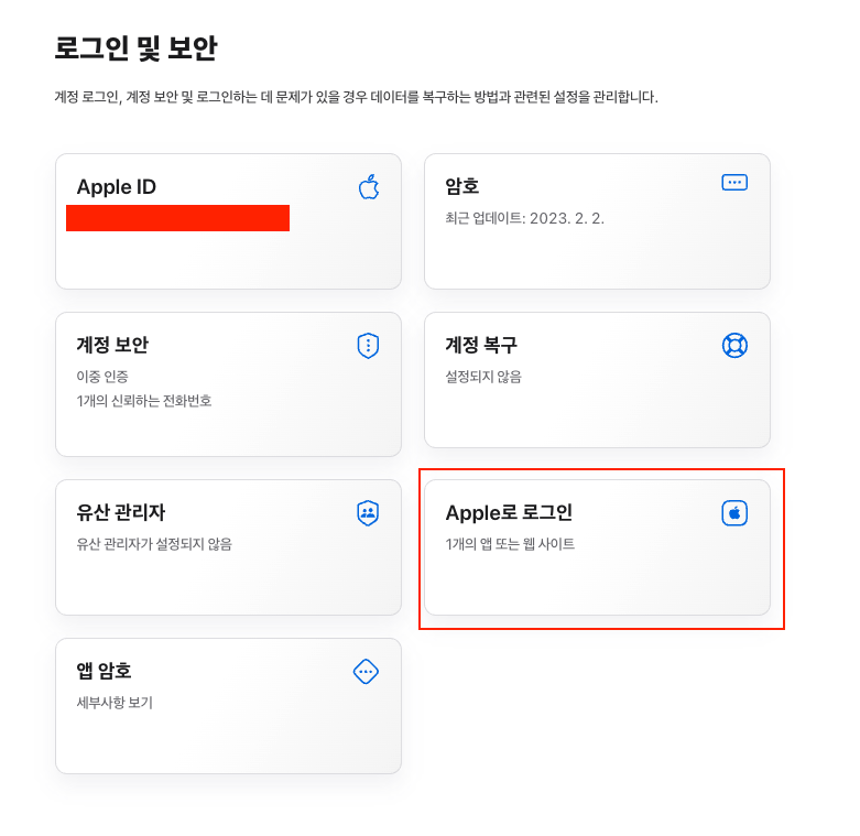 접속해서 Apple로 로그인 사용 중단을 클릭한다.