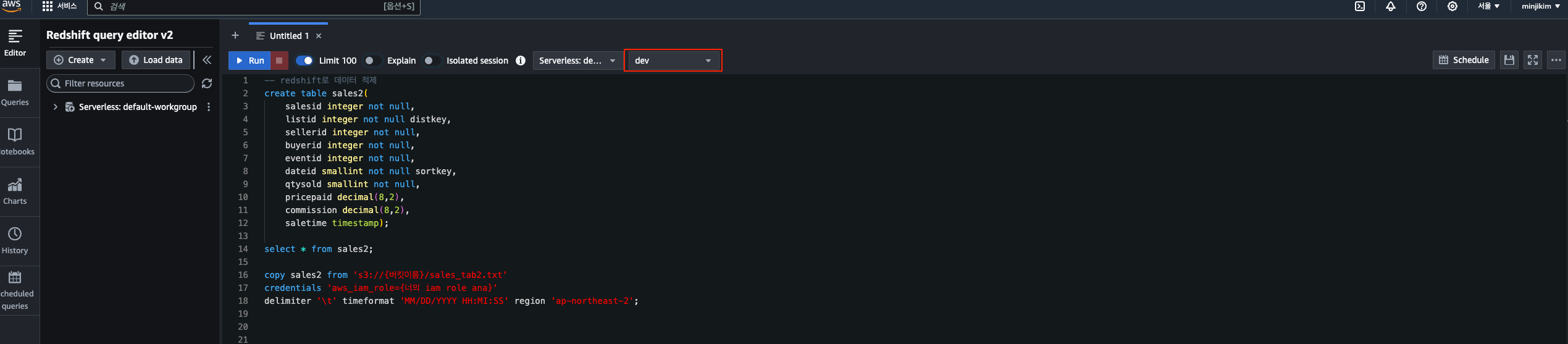 Redshift Serverless로 만들었다면 dev가 뜰 것임.