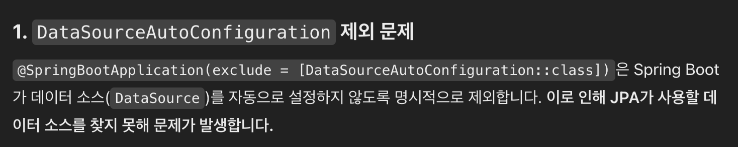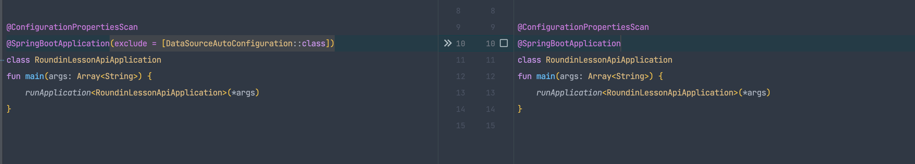 mongoDB를 사용할 때 Config로 DB설정해둔 부분이 있었는데 이를 위해 DataSourceAutoConfiguration을 예외처리 해두었나보다.
