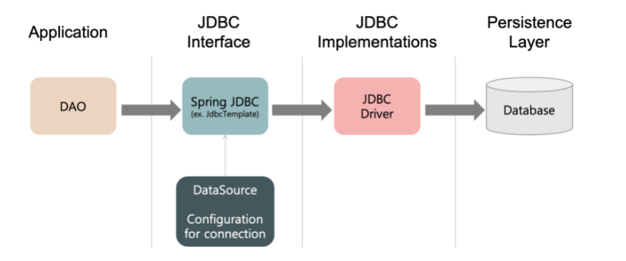 즉 우리가 JDBC를사용하게되면 드라이버를 로딩하고, DB를연결하고, conn을 열고 닫아주고 와 같은 작업을 매번 동일하게 했었다. 허나 JdbcTemplate는 위 같은 작업은 스프링 프레임워크에 맡기고 개발자는 쿼리문을 excute해주는 역할만 하면된다.