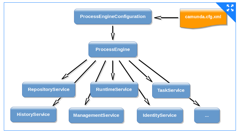 ProcessEngine 에서 워크플로우나 BPMN방법을 포함하는 서비스를 얻을 수 있다.