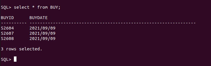 INSERT INTO BUY VALUES ('S2606', SYSDATE);